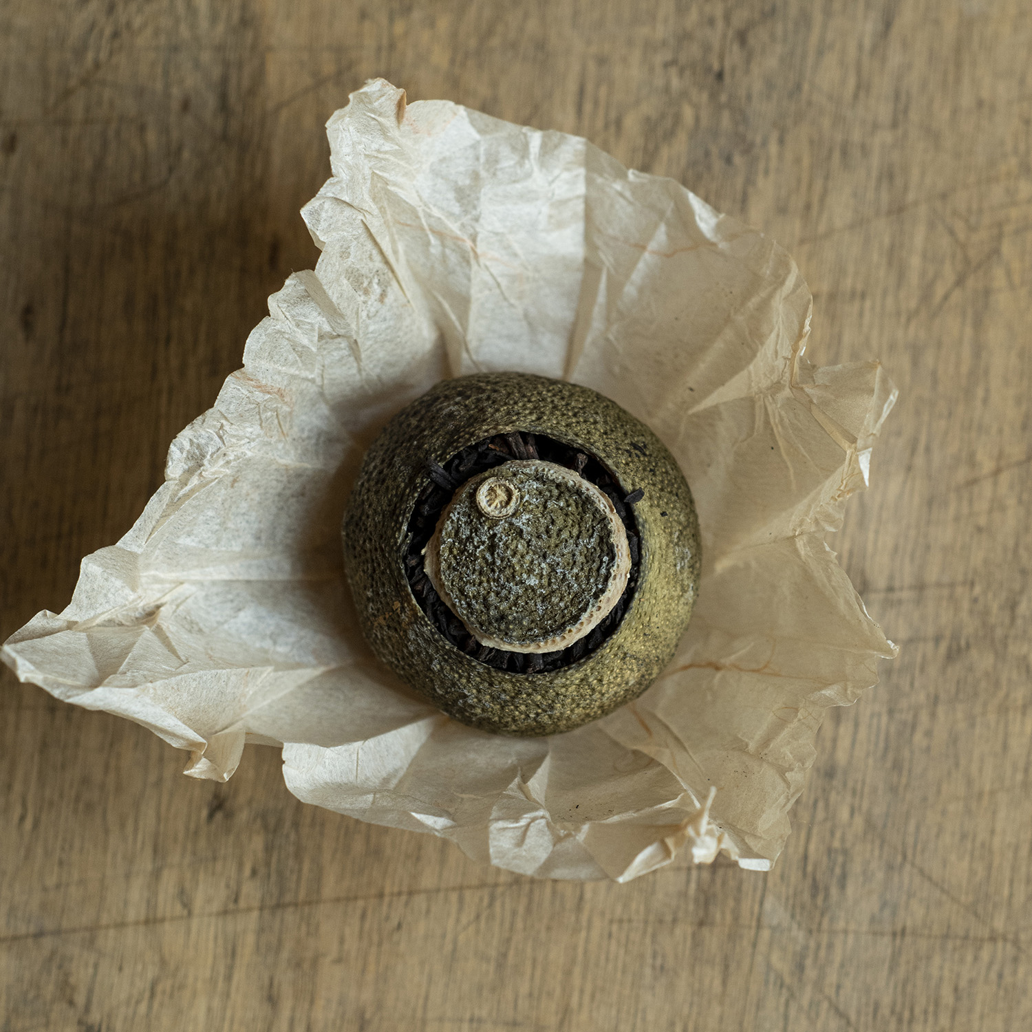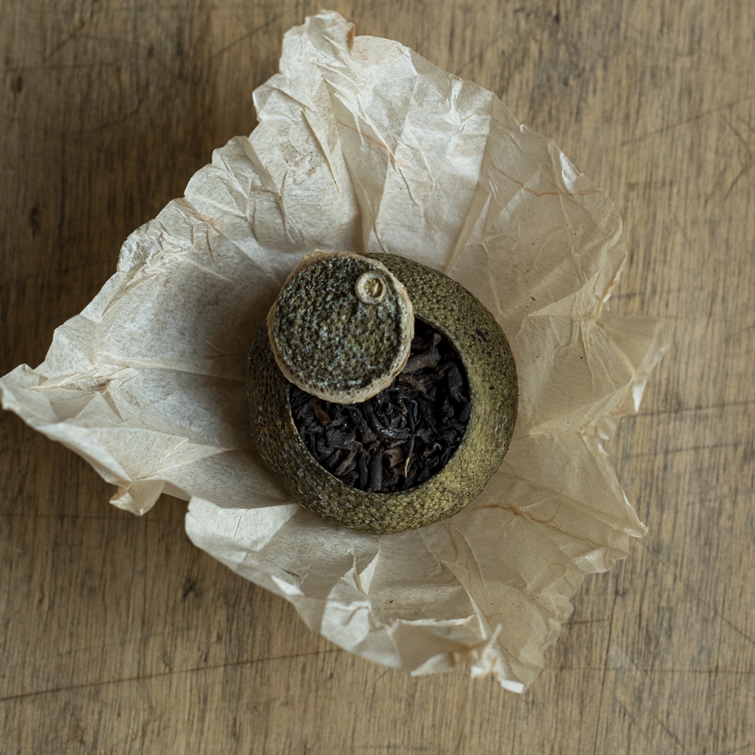 Gānpǔchá: un piccolo mandarino, colmo di tè. Si tratta di un tè fermentato pu’er shou, prodotto a Menghai nello Yunnan e inserito in un piccolo agrume (xiǎoqīnggān).