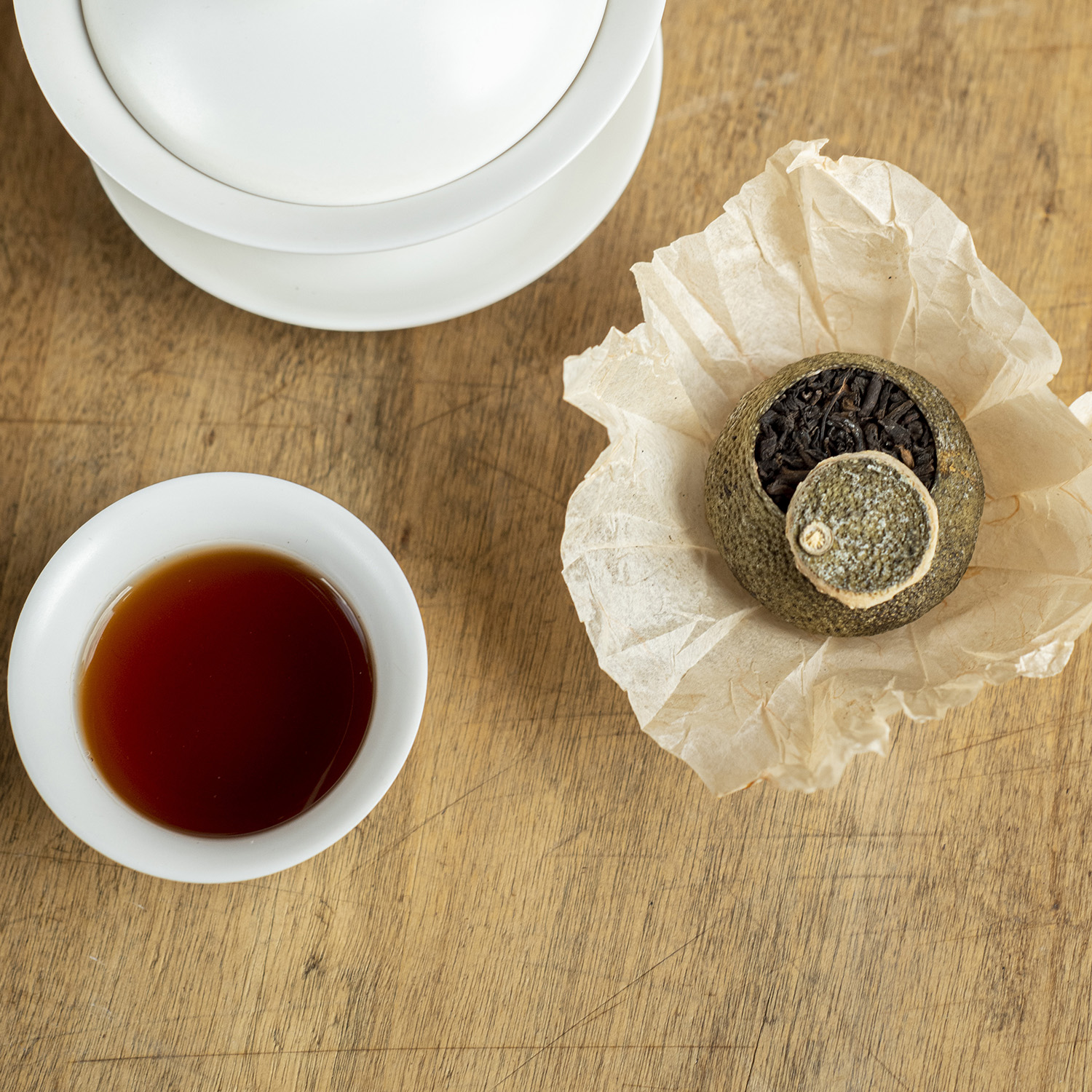 L’aroma della polpa e della scorza del frutto si miscelano con le note dolci e di sottobosco del pu’er.